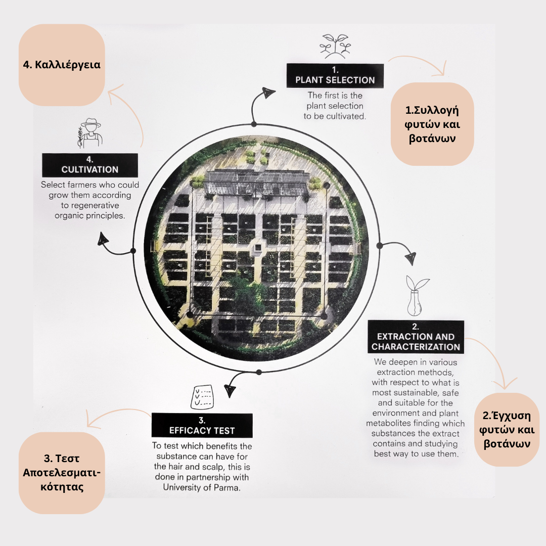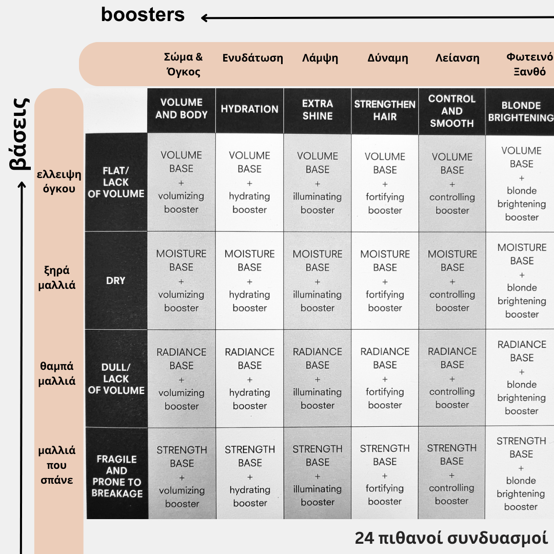 Αποτελείται από 4 βάσεις και 6 boosters με εκχυλίσματα βοτάνων, το κάθε ένα με τα δικά του οφέλη για τα μαλλιά: